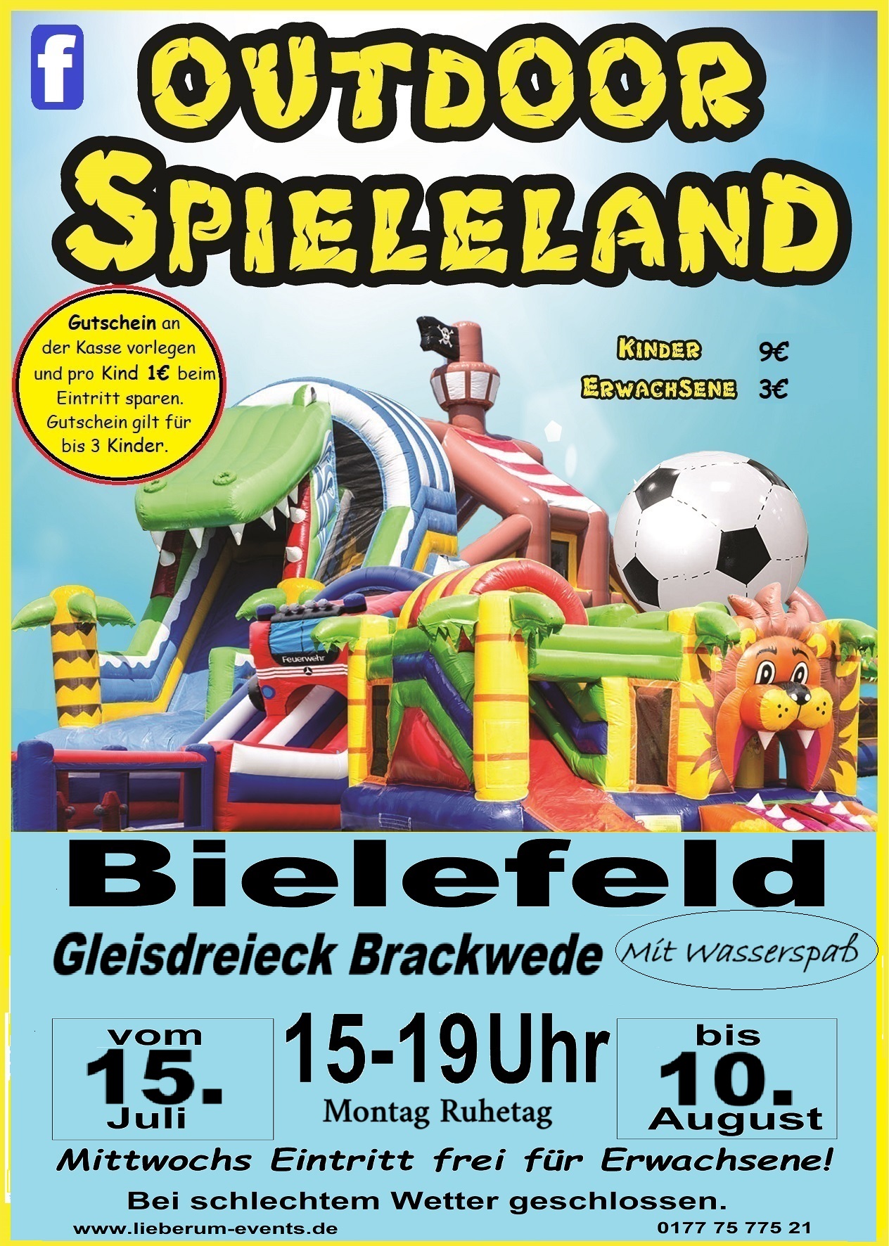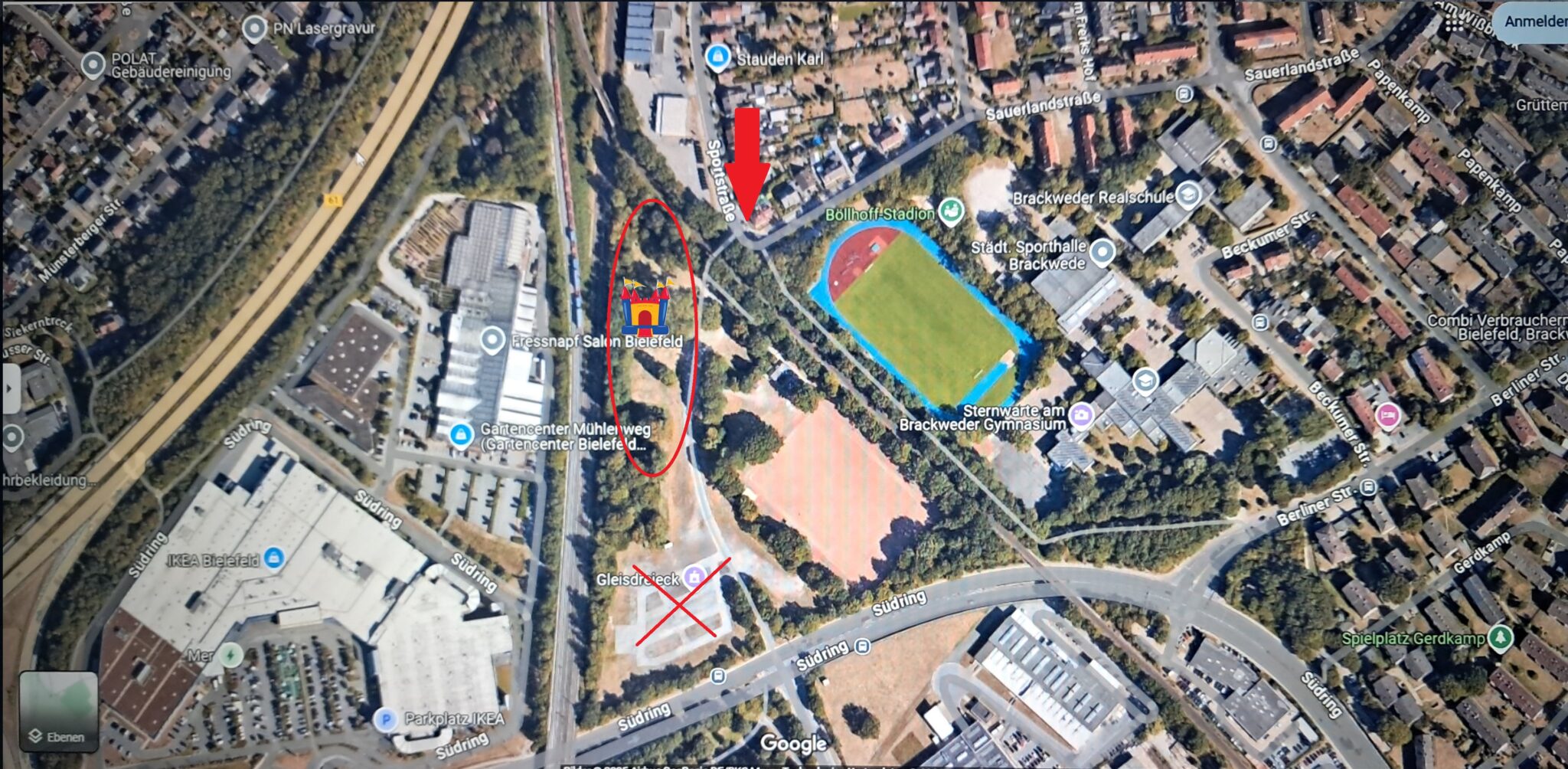 Das Outdoor Spieleland befindet sich nicht auf der Asphalt -und Schotterfläche, sondern auf der Rasenfläche auf dem Festplatz Gleisdreieck in Bielefeld-Brackwede und ist mit dem Auto, NUR in Schrittgeschwindigkeit, über die Sportstraße durch den Brückenbogen (rot-weiße Schranke) zu erreichen. Kostenlose Parkplätze sind vorhanden.